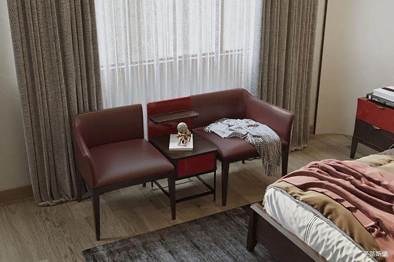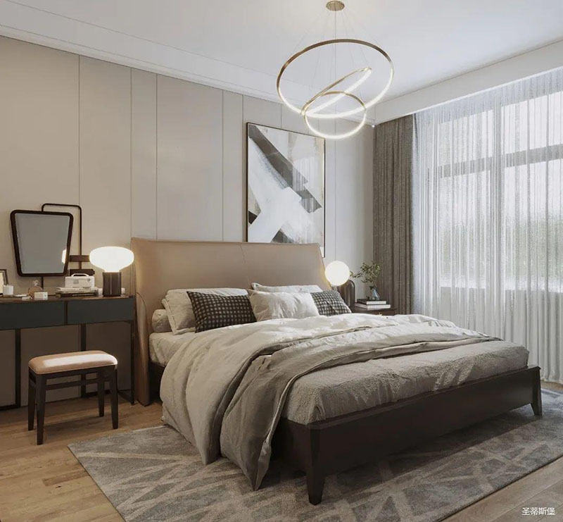 灵活变装的主卧空间,自成独特的设计语言与真挚的感情糅合。经典意式极简软床,流畅顺滑的真皮床屏,赋予了空间温馨高贵的气息。酒红实木质感的床头柜,整齐摆放,欲有“鸿运当头”的美好寓意,塑造出一方简约知性的灵动空间。